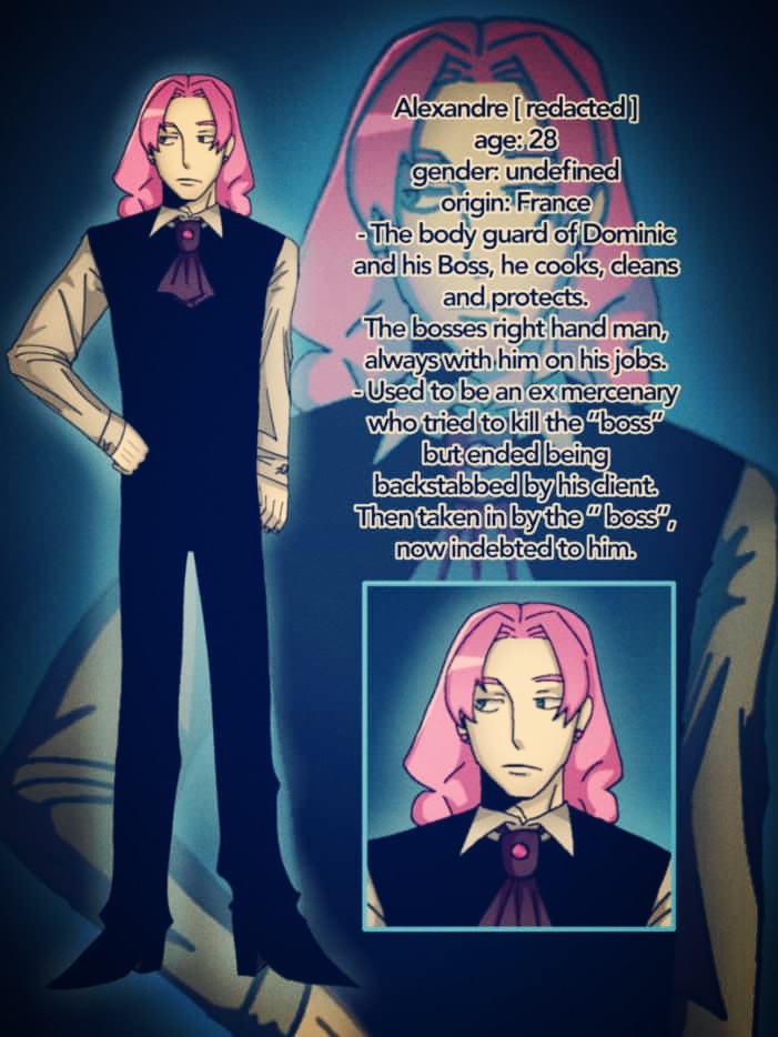 daily routine:Alexandre wakes up and does his hair, making it into two braids. Chooses his outfit and gets Dom ready for school, since he cant himself. He feeds the house and residents. He takes dom to the bus and does whatever job his boss says.